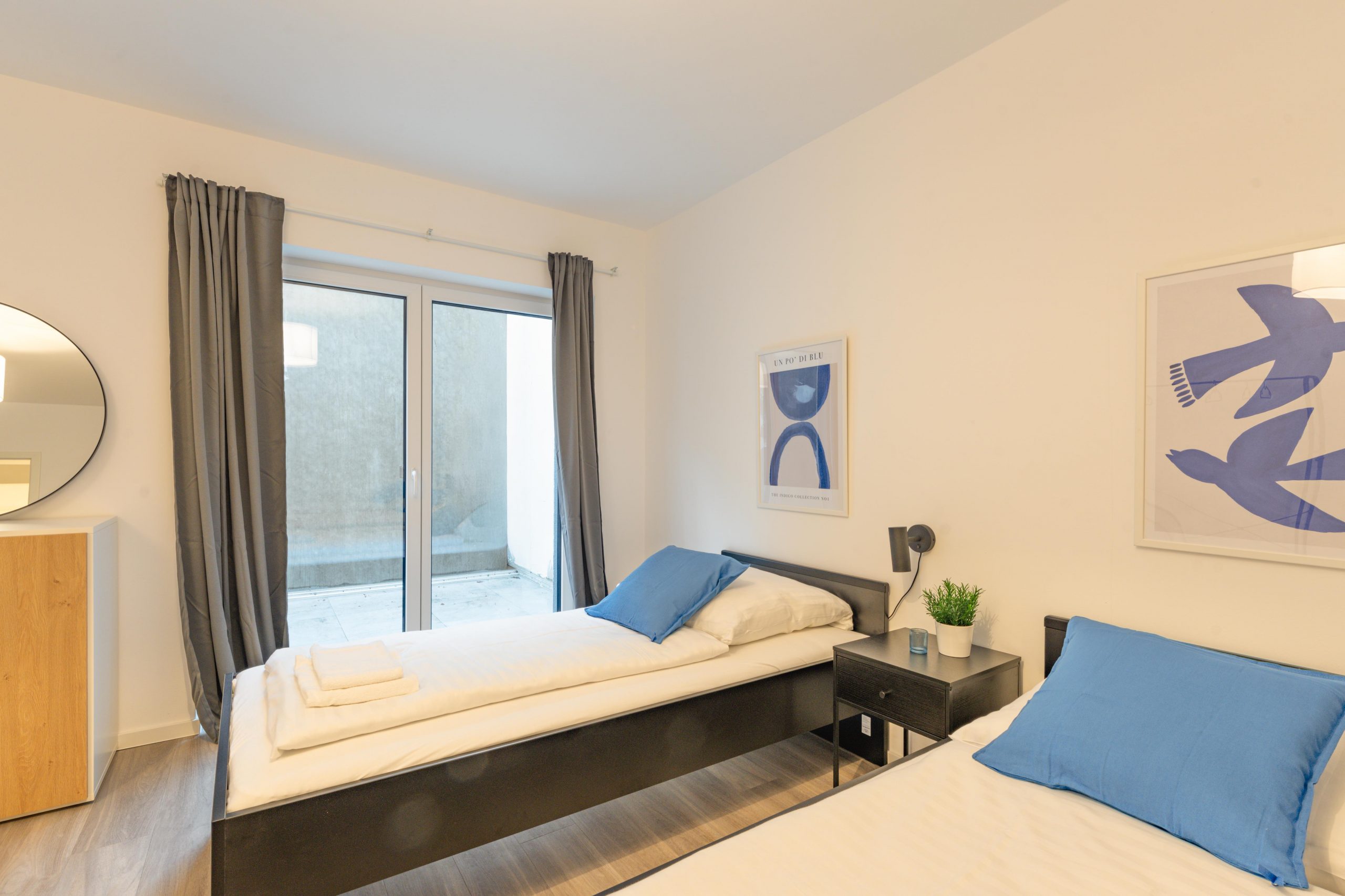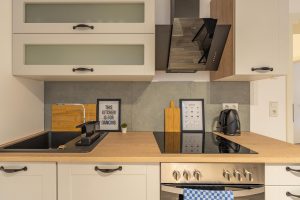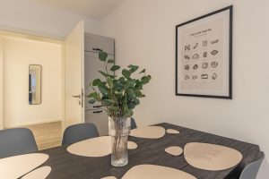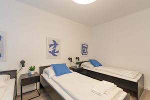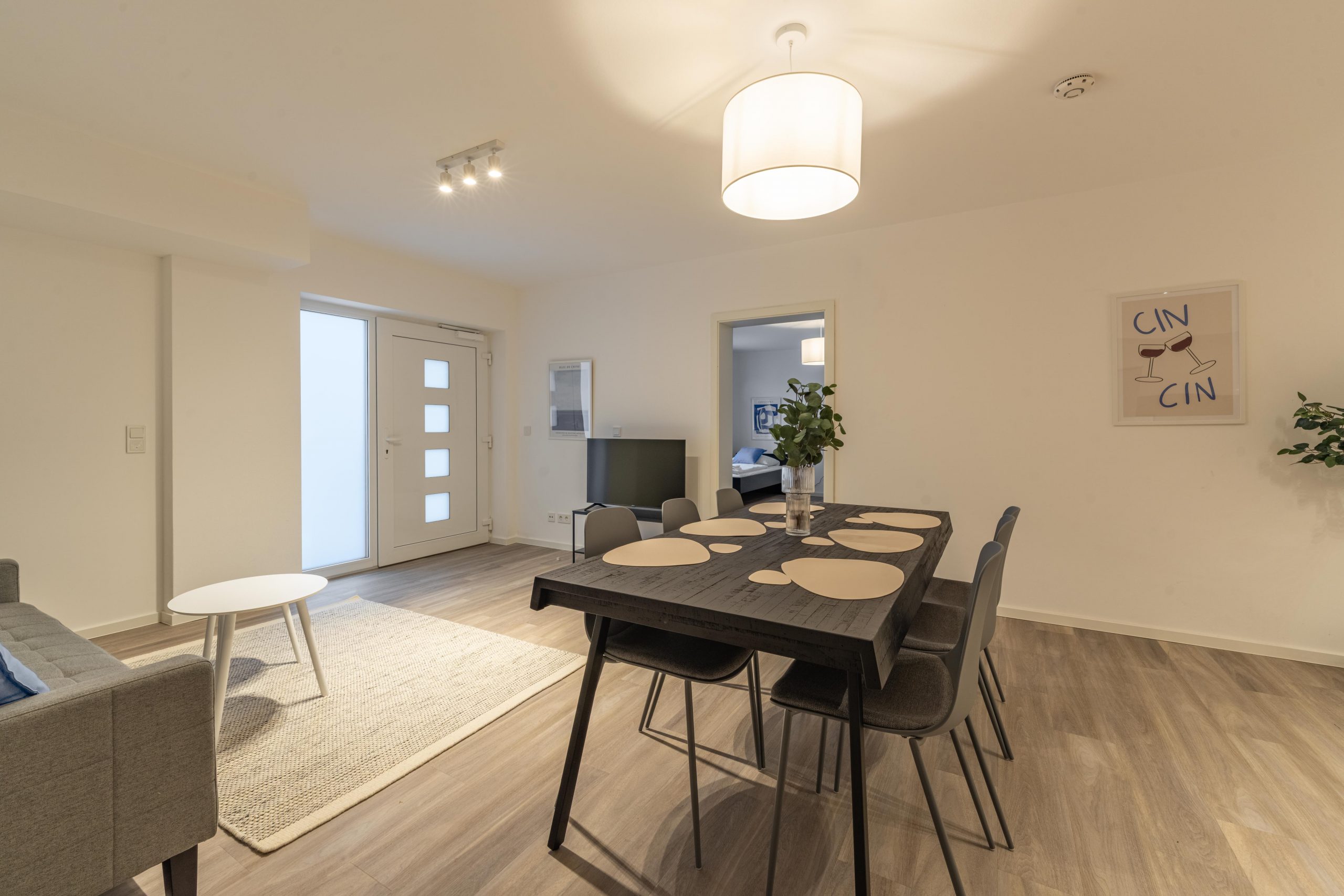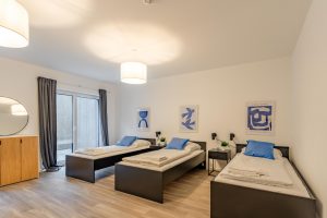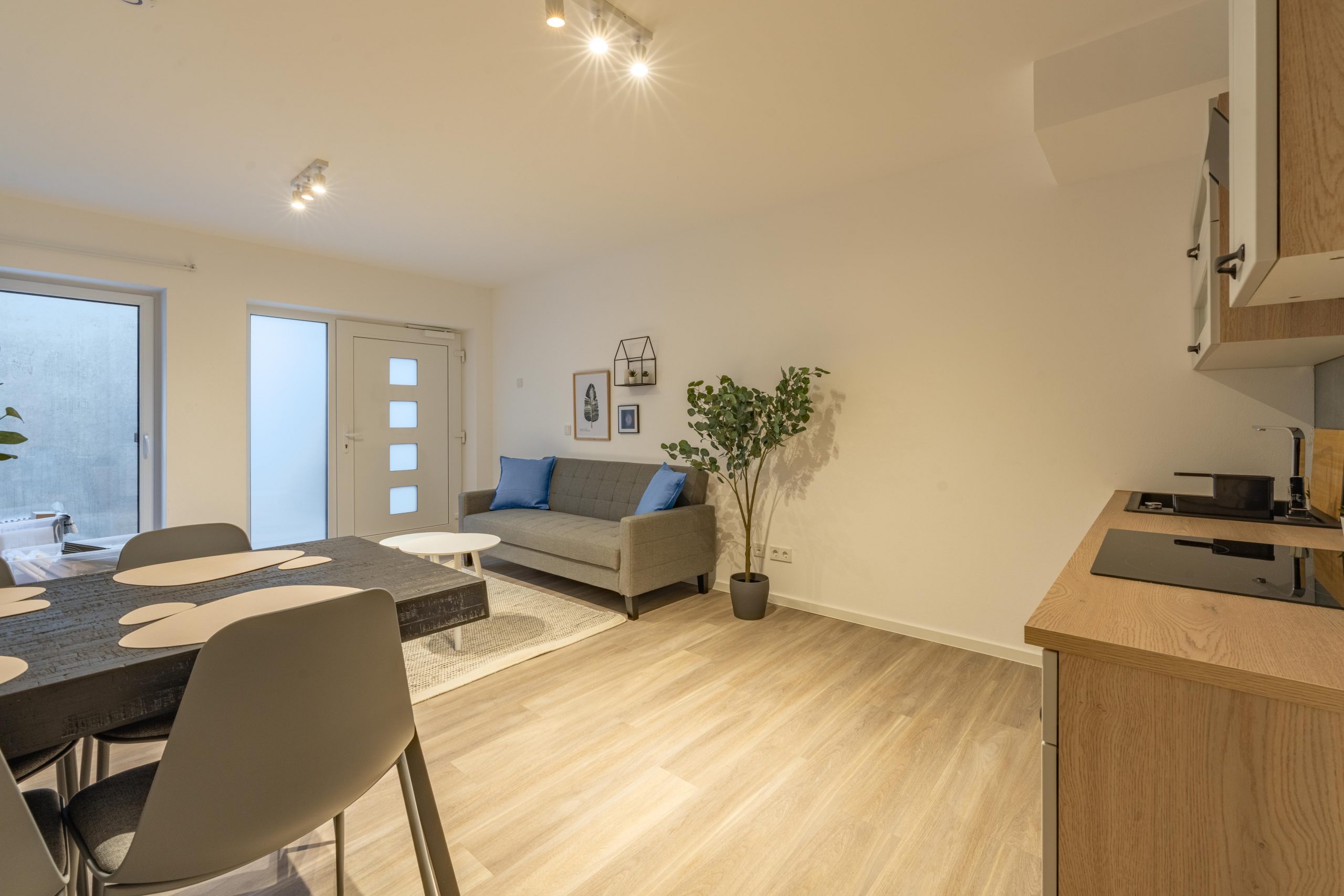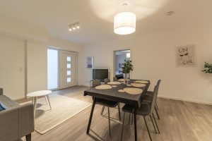 Genieße viel Platz und modernen Wohnkomfort in dieser neu erbauten, hochwertig eingerichteten Souterrain-Wohnung. Ideal für Urlaubs- oder Geschäftsreisende, die die Vorteile einer voll ausgestatteten Unterkunft schätzen. Die Wohnung verfügt über Fußbodenheizung, ein modernes Bad, eine voll ausgestattete Küche sowie neue Möbel. Ein Schlafzimmer mit drei Einzelbetten plus Schlafsofa für einen Gast und ein großzügiger Wohn- und Essbereich bieten Raum für Gemeinschaft und Privatsphäre zugleich.
