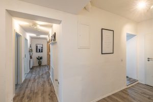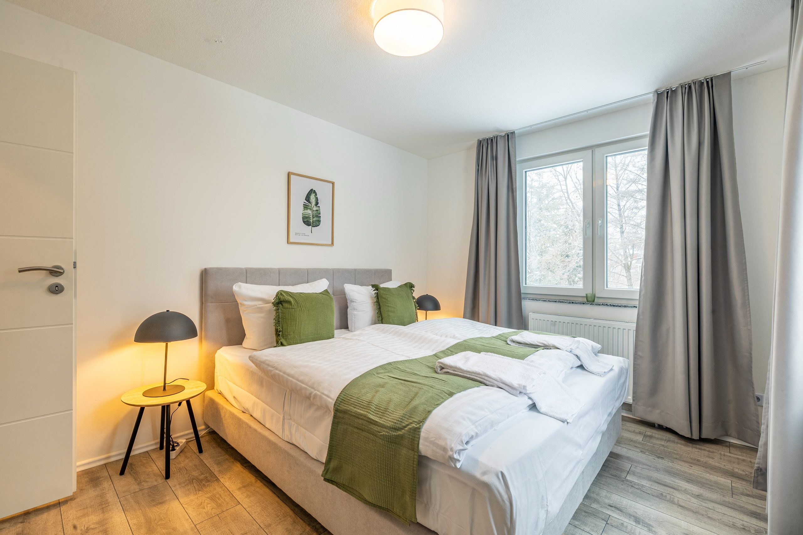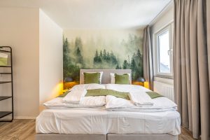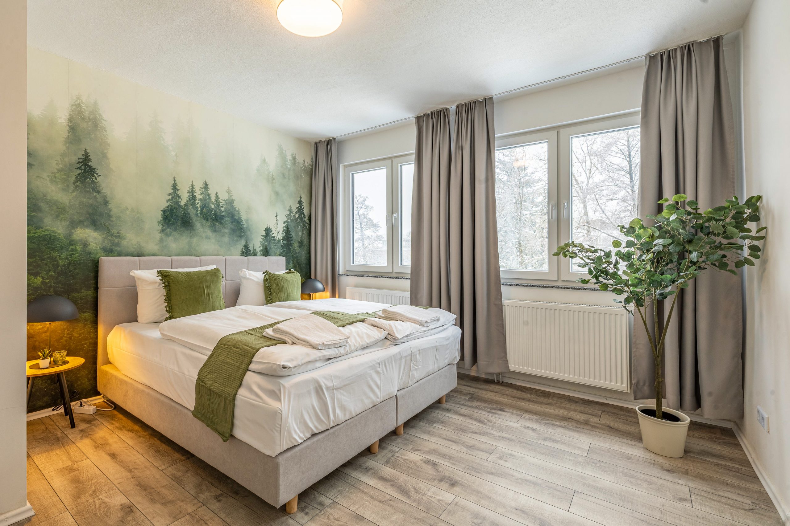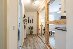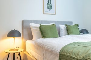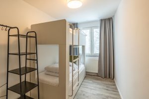 In der ersten Etage gelangst du in die stylische Wohnung mit drei Schlafzimmern. Zwei Doppelbetten sowie ein Etagenbett bieten Platz für insgesamt bis zu sechs Gäste.