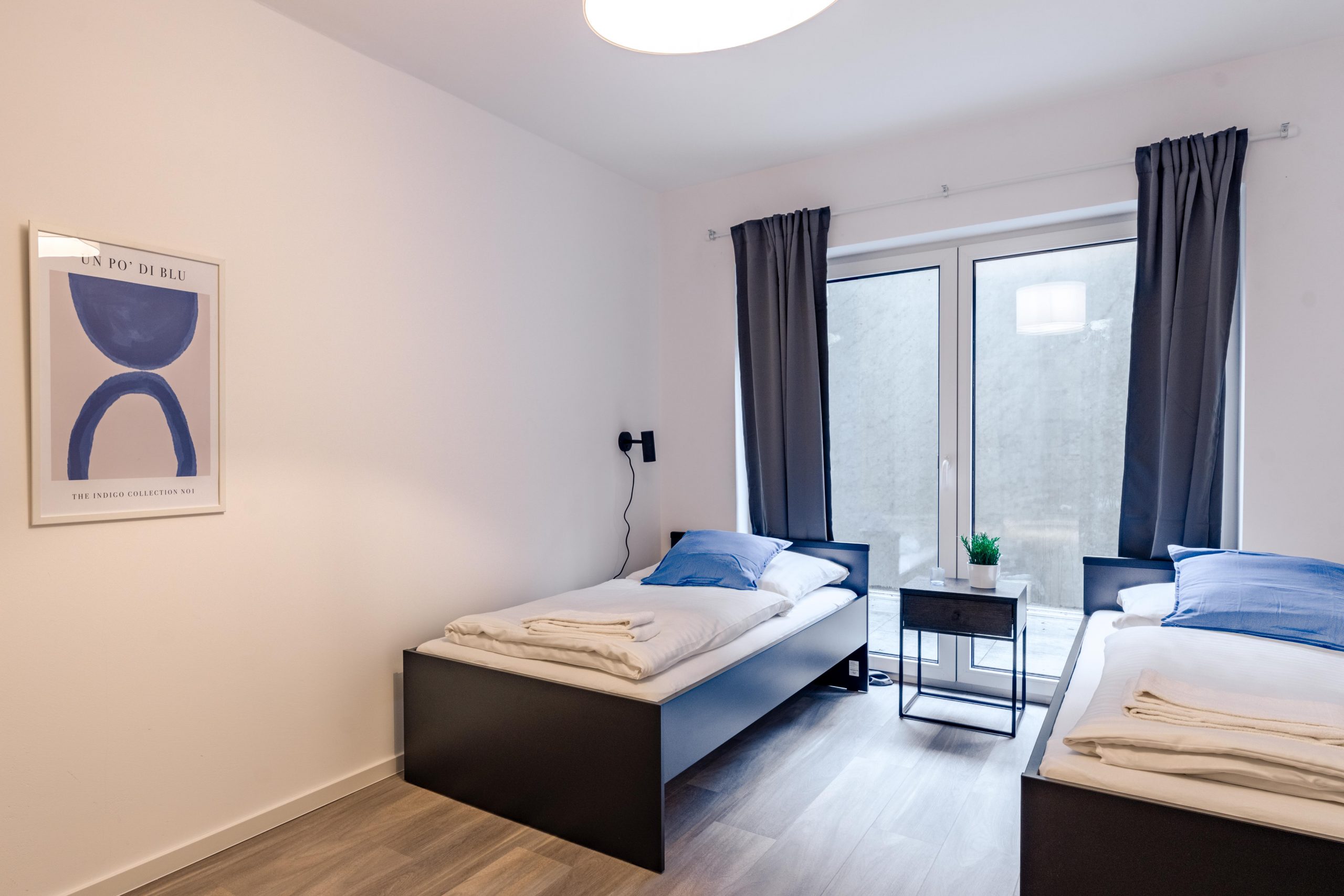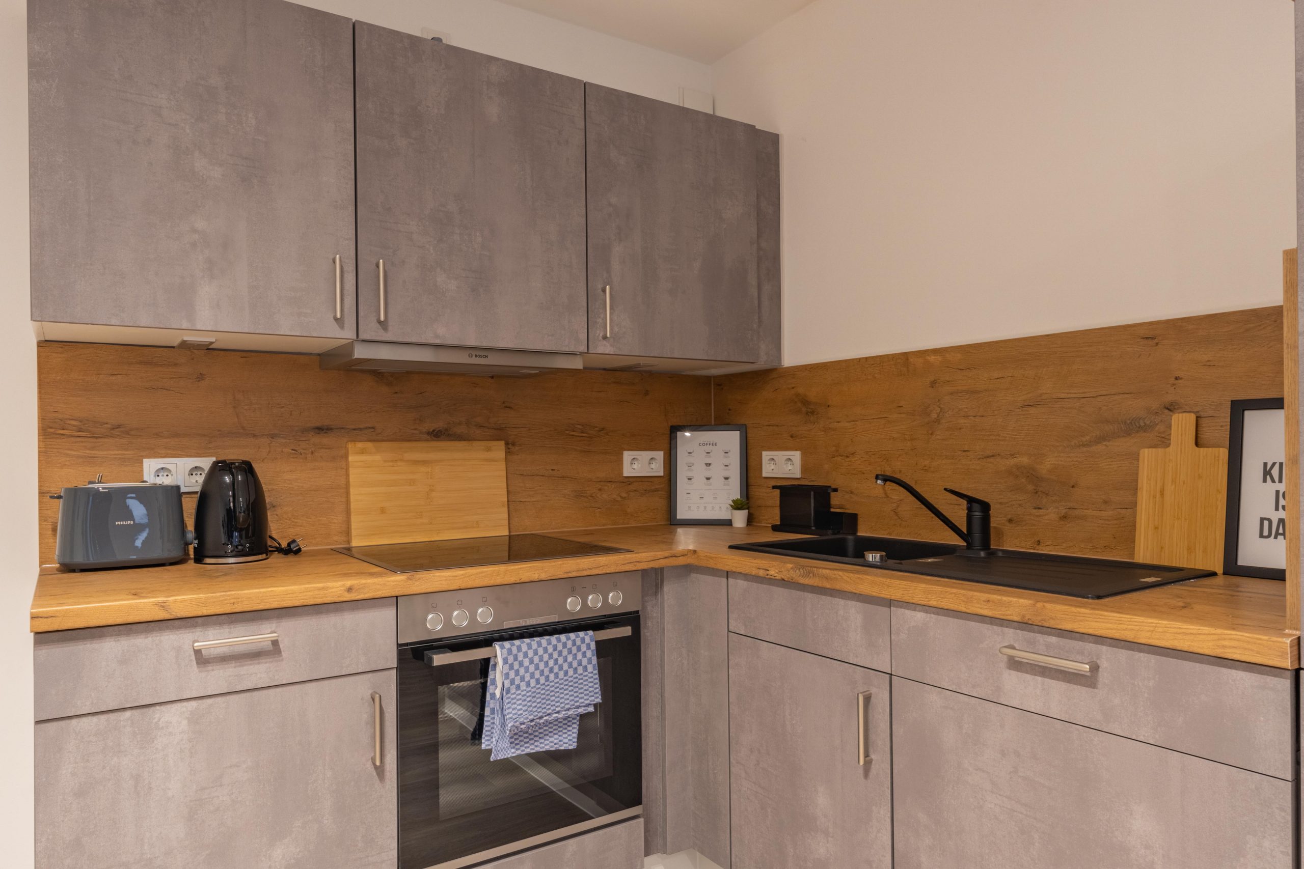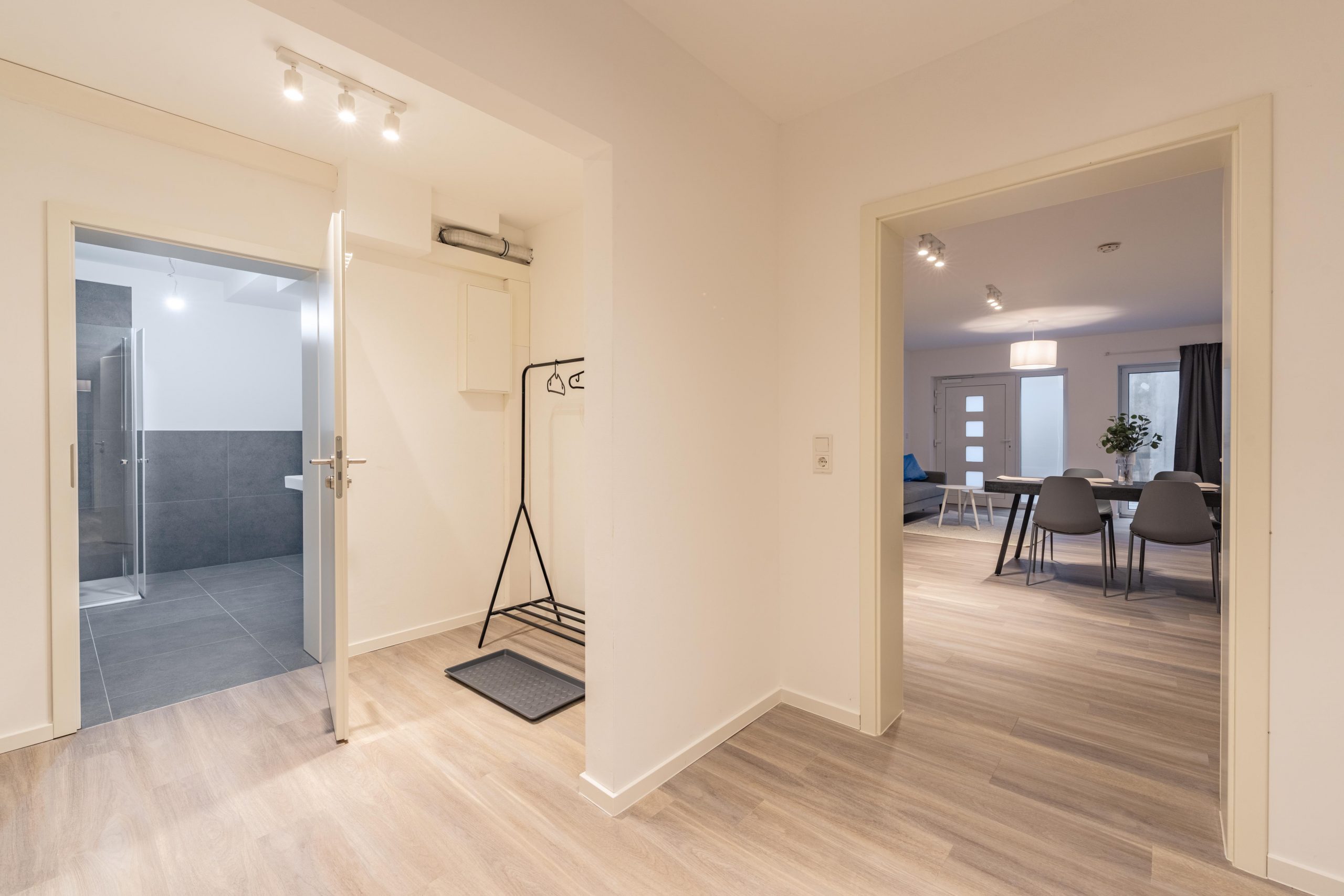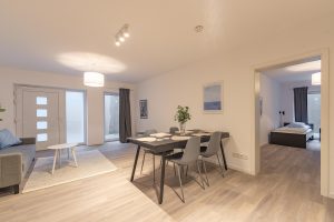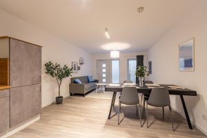 Genieße viel Platz und modernen Wohnkomfort in dieser neu erbauten, hochwertig eingerichteten Souterrain-Wohnung. Ideal für Urlaubs- oder Geschäftsreisende, die die Vorteile einer voll ausgestatteten Unterkunft schätzen. Die Wohnung verfügt über Fußbodenheizung, ein modernes Bad, eine voll ausgestattete Küche sowie neue Möbel. Zwei Schlafzimmer mit drei Einzelbetten plus Schlafsofa für einen Gast und ein großzügiger Wohn- und Essbereich bieten Raum für Gemeinschaft und Privatsphäre zugleich.